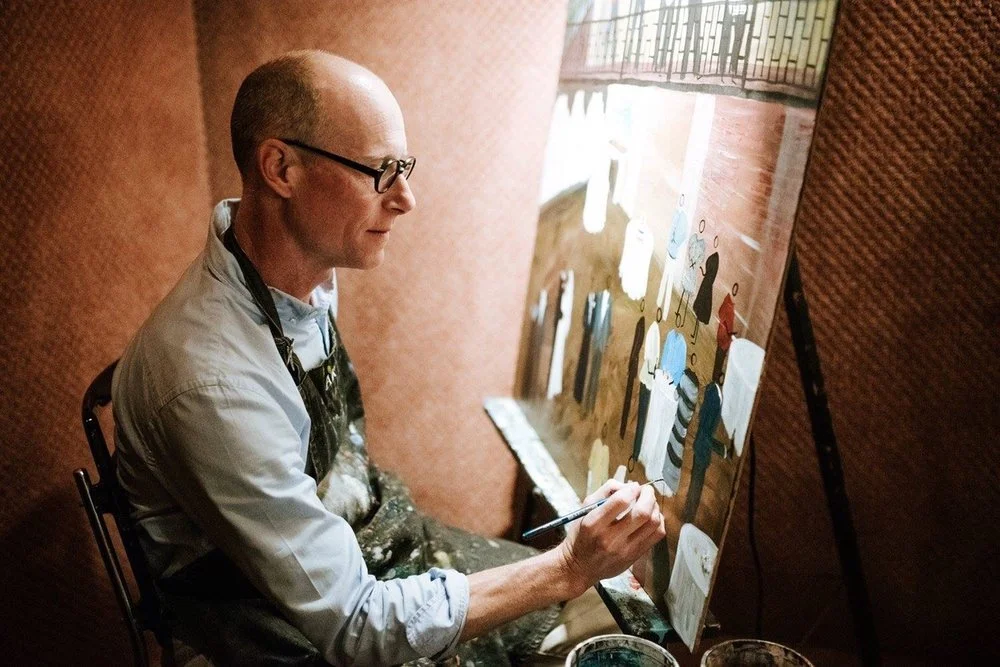 Paul Schexnayder is a Louisiana-based painter, author, and illustrator whose work explores atmospheric conditions and their influence on daily life. Through a signature motif of vertical brushstrokes—evoking the moss-covered landscapes of the South—Schexnayder captures the invisible presence of water vapor in color, shape, and form. His mixed-media compositions often incorporate architectural elements, flora and fauna, and symbolic characters, weaving together narratives filled with mystery, memory, and the passage of time.